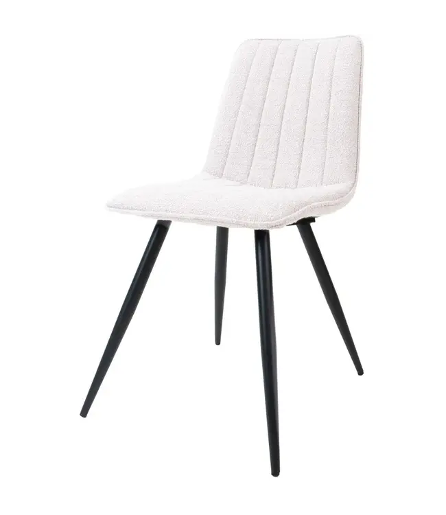 Eetkamerstoel Joppe is bekleed met een zachte boucle stof, wat zorgt voor een luxueuze en comfortabele zitervaring.