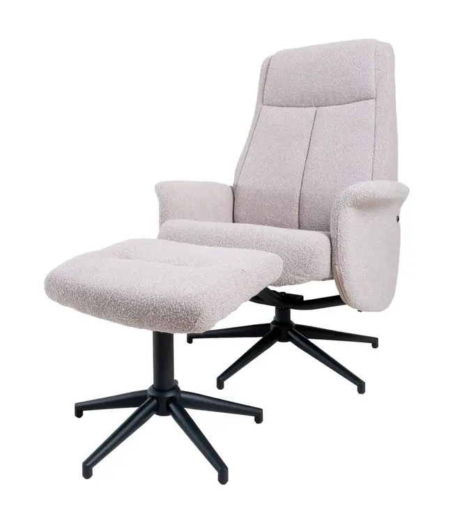 Ontspan in stijl en comfort met onze relaxfauteuil Bindy met bijpassende hocker. Deze relaxstoel en poef zijn bekleed met een zachte en duurzame bouclé stof, waardoor ze niet alleen een stijlvolle uitstraling hebben, maar ook heerlijk aanvoelen om in weg te zakken na een lange dag.
