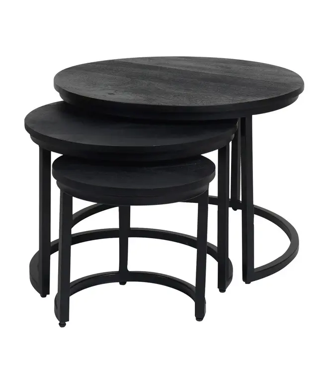 De tafels kunnen afzonderlijk van elkaar neer gezet worden of juist bij elkaar! De drie tafeltjes passen perfect in elkaar en hierdoor ontstaat een speels effect. Het ronde tafelblad (± 1,2 cm dik) is gemaakt van duurzaam mangohout.